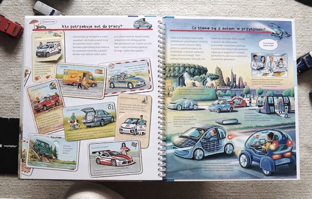 W tej książce zaskoczyło mnie kilka rzeczy, których o samochodach po prostu nie wiedziałam. Najbardziej jednak cenię ją za to, że podejmuje temat bezpieczeństwa podczas jazdy, ale też na drodze. Jako piesi przecież także mamy do czynienia z samochodami, dlatego warto wiedzieć, jak działają i rozumieć, że otaczają nas na każdym kroku. Są ważnym i bardzo przydatnym elementem codzienności. Korzystajmy więc z nich mądrze i z rozwagą. Zachwyceni będą miłośnicy przekrojów oraz ciekawostek ze świata motoryzacji. Jest tu nawet wycieczka do przeszłości i zerknięcie na samochody przyszłości.